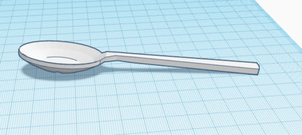 And then we get to the spoon. I honestly did this one in class while you were showing me how to do it and I got lost but I think it looks useable. I mean I would eat cereal with it. I used the half circle for the base of the spoon, with another one to make it concave. Rectangles and cubes to make the arm thingy. Yeah she’s not cute but it’ll work.