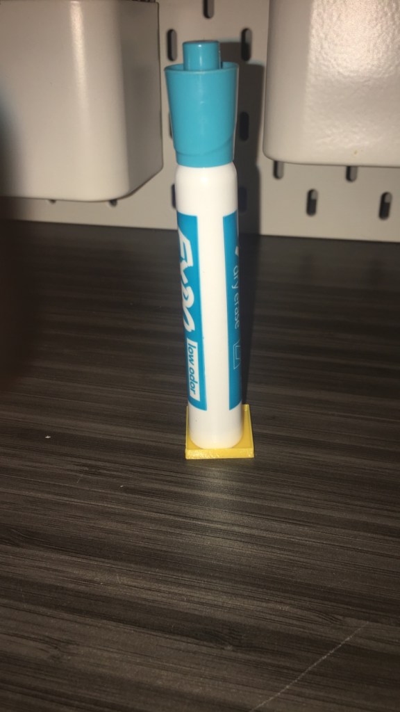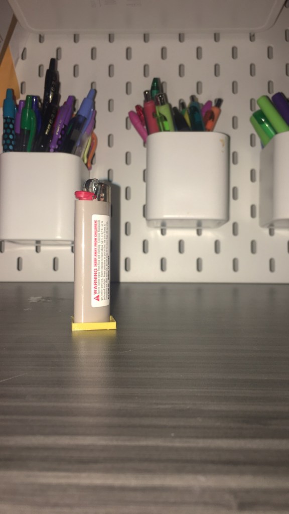 Alright so here’s the thing. I made this for another chair in my house, but when I made the design the first time, I made the dimensions smaller than the chair leg becasue it was supposed to just be a plate and then I would glue it onto the chair. BUT then, I changed my design to the cup because I was told it would be a better idea and it totally is… if I had changed the dimensions. So it is way too small for the orignal chair, BUT I found not one, but TWO chairs to put this under.